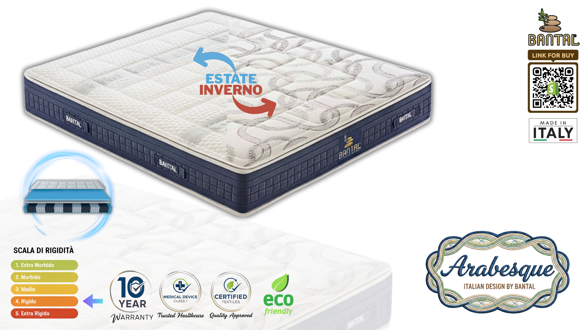 Il Materasso Arabesque rappresenta la soluzione ideale per chi ricerca comfort e versatilità stagionale. Dotato di 1600 micromolle indipendenti, offre un supporto anatomico preciso che si adatta perfettamente al corpo, riducendo i punti di pressione. Il polifoam HR antistress da 4cm garantisce un'accoglienza morbida senza compromessi sulla stabilità strutturale. Il pannello estivo in tessuto Breeze favorisce la traspirazione durante i mesi caldi, mentre il lato invernale con lana mantiene il calore corporeo nelle stagioni fredde. Una scelta consapevole per il riposo di qualità tutto l'anno.