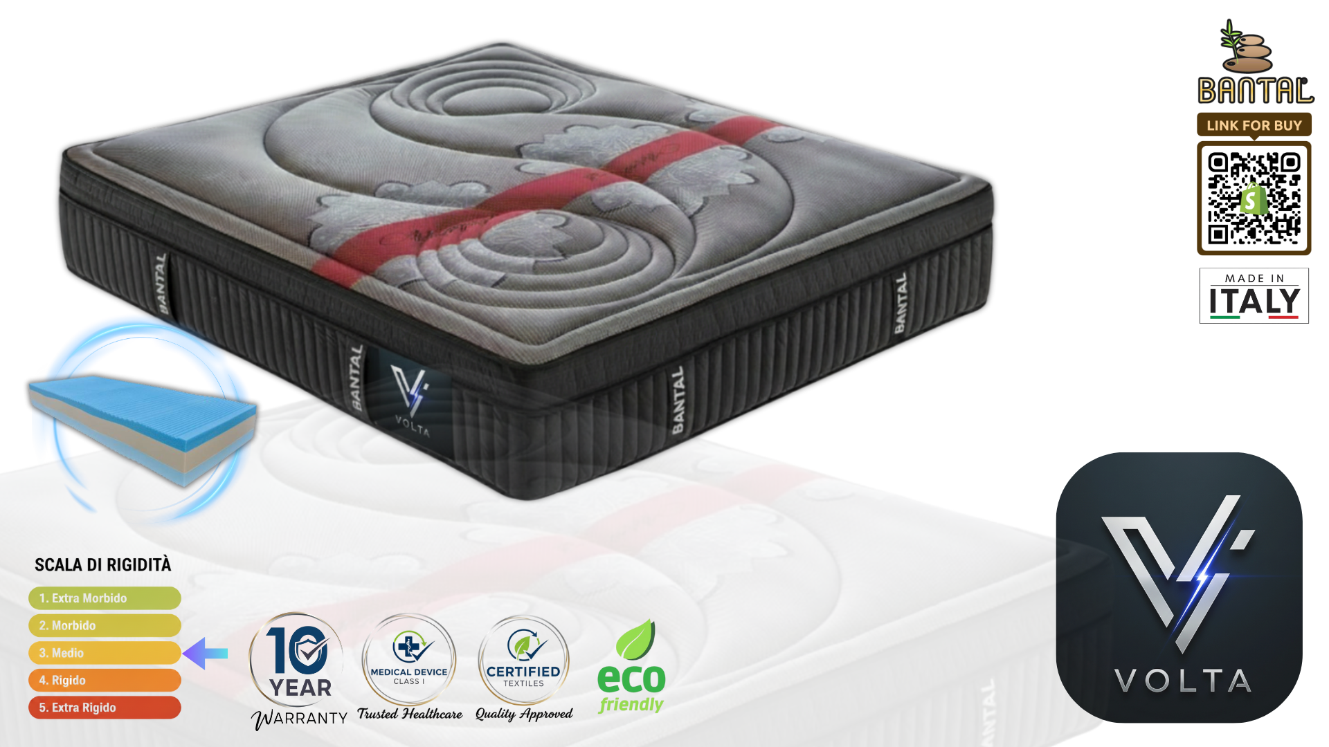 Il Materasso Modello Volta è stato appositamente progettato per scaricare l'energia elettrostatica in eccesso durante il sonno. Con questo innovativo sistema, potrai godere di un riposo profondo e rilassante, evitando fastidi elettrici e beneficiando di un sonno più rigenerante. Scegli il comfort e la qualità del Materasso Modello Volta per migliorare la tua esperienza di riposo.